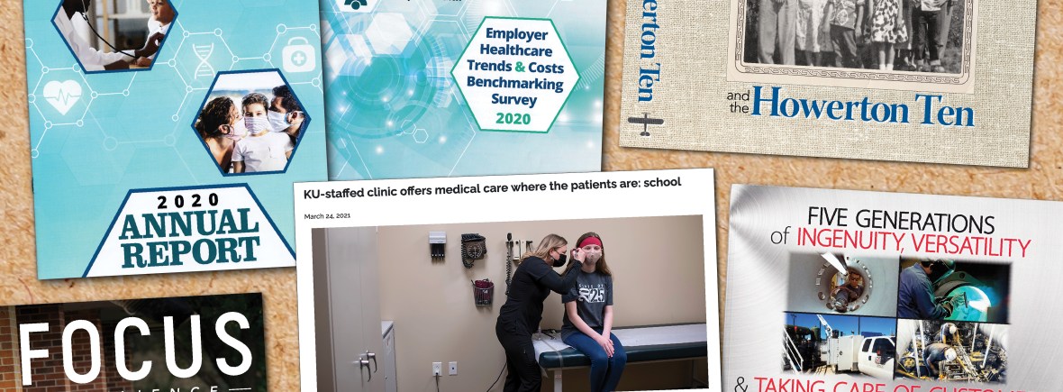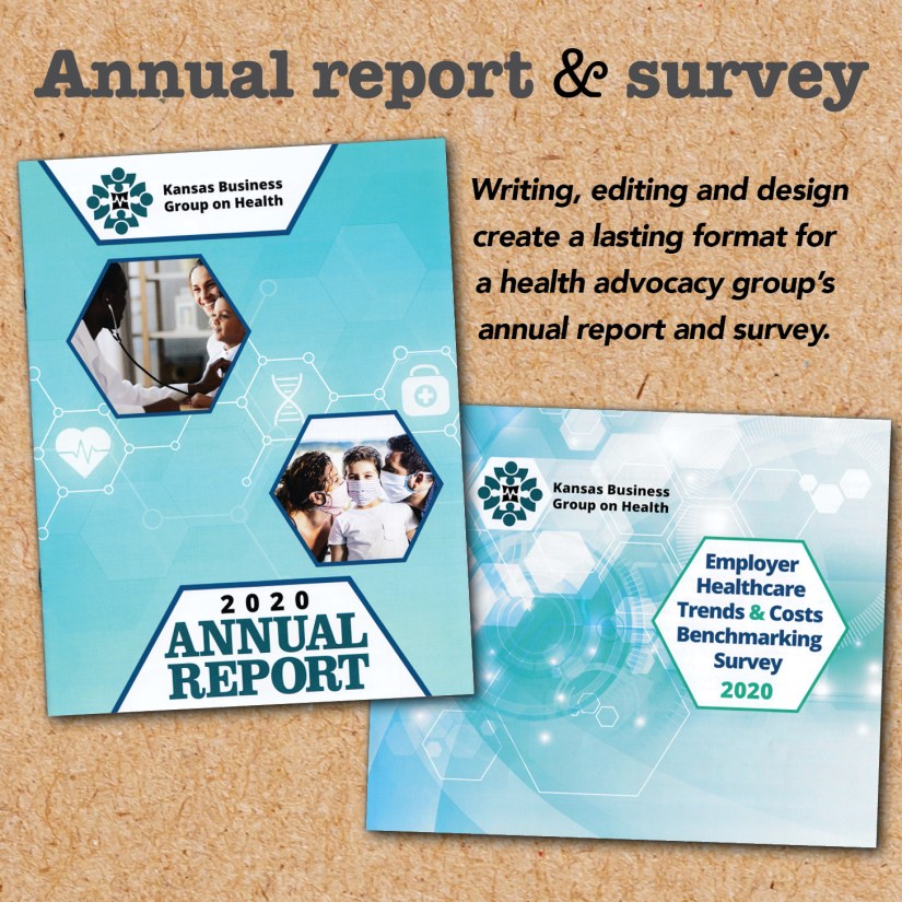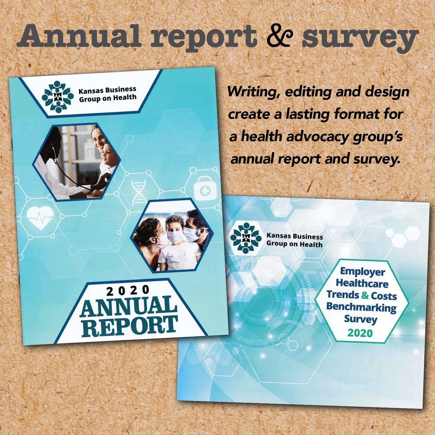 Projects that combine writing, editing and design are a favorite. They involve using a range of skills and working with a client from project conception to completion, including printing if needed. Kansas Business Group on Health’s annual report and survey results are recent examples. They’re affiliated with a health advocacy organization I’ve worked with for years and needed to create first-time publications detailing the group’s work and their inaugural survey on insurance coverage and costs.